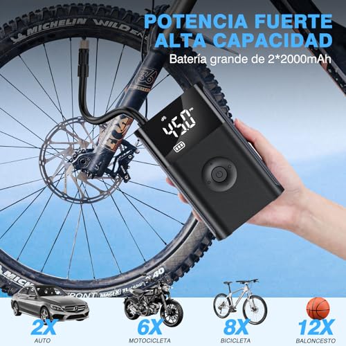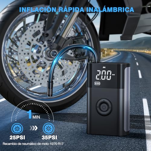 Tiene una presión máxima de 150 PSI y una potencia suficiente para inflar neumáticos de coche, moto y bicicleta de forma rápida. Por ejemplo, puede inflar una llanta de coche típica (195/65/R15) desde 25 a 35 psi en apenas 2 minutos. Además, el dispositivo cuenta con un sistema de parada automática que impide inflar demasiado el neumático, ayudando a mantener la seguridad durante su uso.