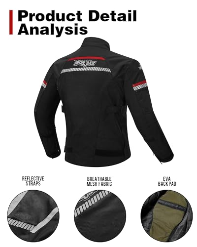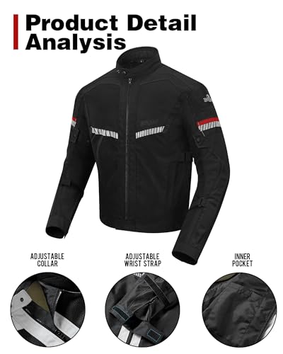 La chaqueta de moto BORLENI está confeccionada en poliéster 600 Denier, un material conocido por su alta resistencia y durabilidad. Además, incorpora tejido de malla de poliéster con elasticidad que aporta un tacto transpirable y cómodo, especialmente en las jornadas calurosas del verano para hombre. Su diseño incluye cinco protecciones extraíbles: cuatro en hombros y codos con certificación CE nivel 2 y un protector de espuma EVA en espalda, sumando así la armadura adecuada para el estándar de seguridad.