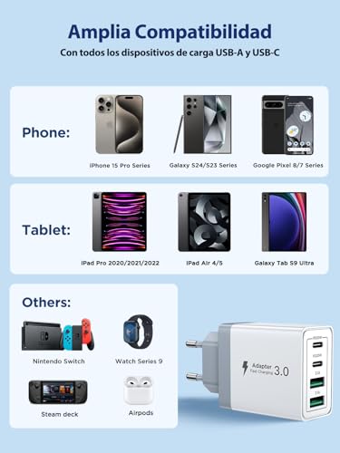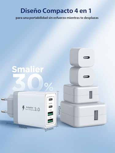 Imagina que estás en casa con varios dispositivos que necesitan carga: un iPhone 14 Pro, una tablet, los auriculares inalámbricos y el móvil de un familiar Samsung Galaxy. Antes tenías que buscar y conectar diferentes cables y cargadores. Con este cargador rápido de pared, solo necesitas un enchufe y un cable para cada dispositivo, todos con buena potencia y sin preocupaciones por la velocidad de carga.