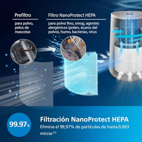 La calidad del aire en interiores es un aspecto que cada vez preocupa más a quienes quieren reducir contaminantes como polen, polvo y partículas microscópicas. Este purificador de aire utiliza un avanzado filtro HEPA NanoProtect que elimina el 99,97 % de las partículas tan pequeñas como 0,003 micras, incluso virus y bacterias. Esto es especialmente valioso para quienes tienen alergia o problemas respiratorios, ya que el filtro HEPA ayuda a eliminar eficientemente alérgenos del aire.