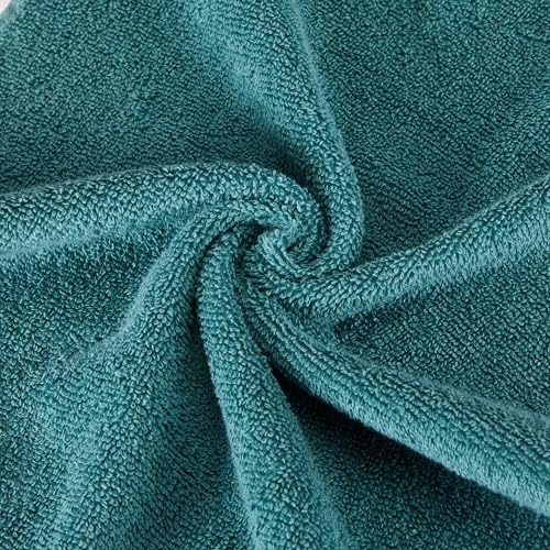 Conjunto de 6 toallas de mano de algodón orgánico de color verde azulado apiladas, destacando su textura suave y duradera