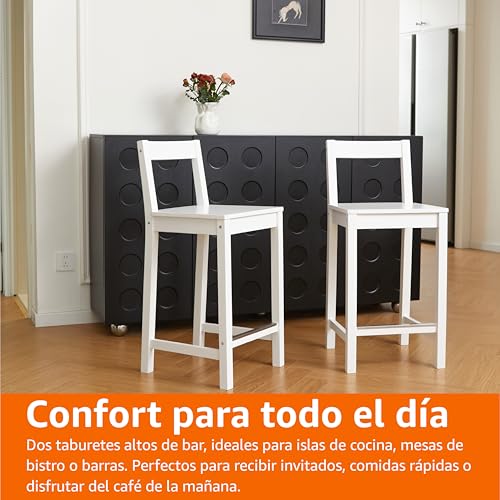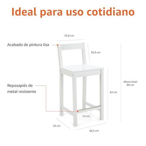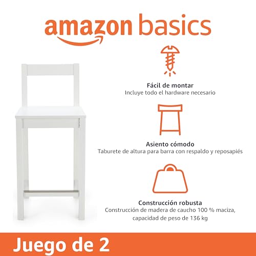 El juego de 2 taburetes de cocina de Amazon Basics presenta un diseño sencillo pero práctico, con asiento y respaldo fabricados en 100 % madera maciza, pintados en un tono blanco que encaja bien en ambientes de hogar y cocina modernos o clásicos. La altura total de cada taburete es de 87,9 cm, siendo el asiento a 61 centímetros, ideal para barras o mesas altas.