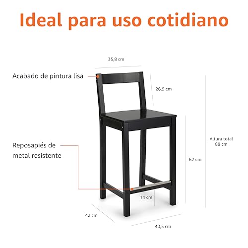 Los taburetes de Amazon Basics ofrecen una opción económica y estilizada, ideales para cocinas o barras. Muchos destacan su diseño minimalista en negro y madera que se adapta a diversos estilos decorativos. La facilidad de montaje también es un punto a favor, con instrucciones claras que permiten ensamblarlos rápidamente. Su respaldo y reposapiés brindan un nivel de confort básico, aunque varios usuarios mencionan que, tras un uso prolongado, pueden resultar incómodos.
