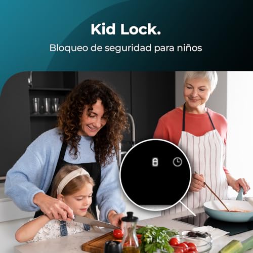 Imaginemos un día con esta placa: empiezas calentando los ingredientes para un sofrito en el fuego más pequeño, mientras controlas el tiempo con el temporizador sin miedo a dejar nada al descuido. Luego, activas el keep warm para mantener la salsa lista mientras cueces pasta en el otro fuego. Todo sin riesgos para los niños, gracias al bloqueo de seguridad.